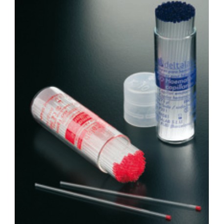 De vidrio soda con código de colores impreso, rojo con heparina y azul sin heparina y con tres longitudes para adaptarse al las centrífugas. En estuches de 100uds.