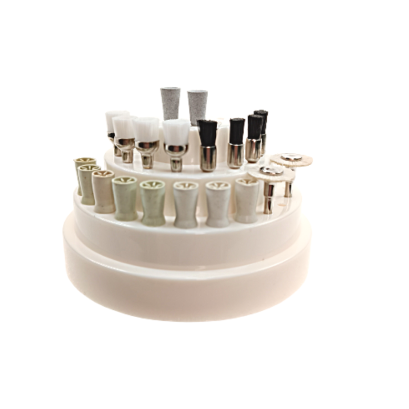 8 Copas de Pulido, 4 Cepillos Cerda Nylon Blanco, 4 Cepillos Cerda Nylon Negro, 2 Cepillos Disco Pelo Cabra Blanco y 2 Copas de Pulido Diamantadas.