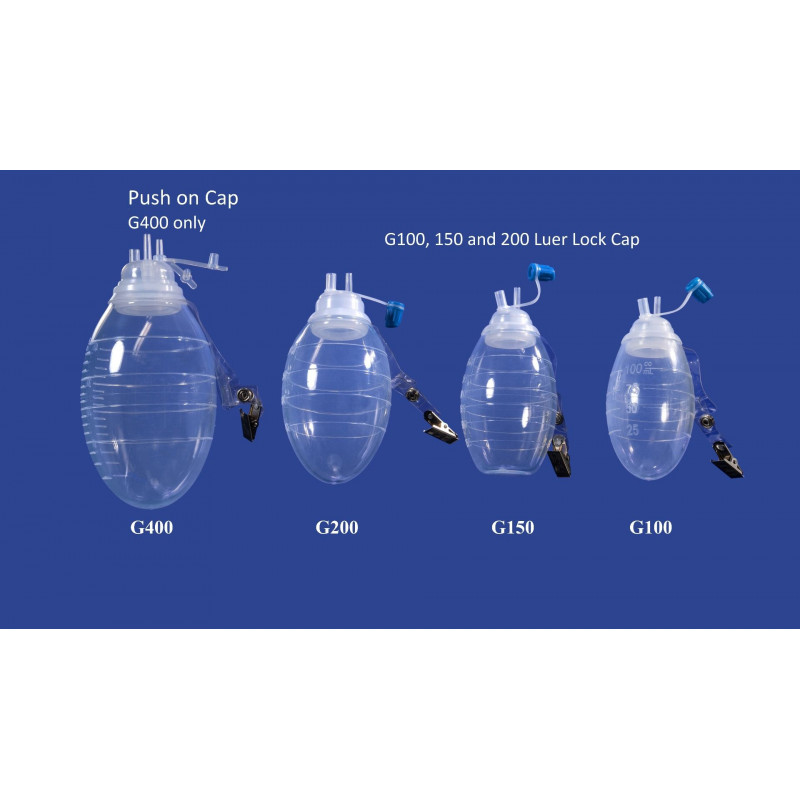 • Tapón Luer Lock para un cierre seguro y vaciado de jeringas en 100, 150 y 200 cc. 400cc tiene una tapa a presión.