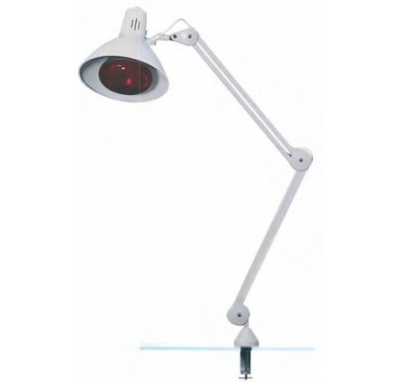 Lámpara de infrarrojos con bombilla de 275W para tratamientos de termoterapia. Equipada con brazo articulado y mordaza para fjación en mesas.