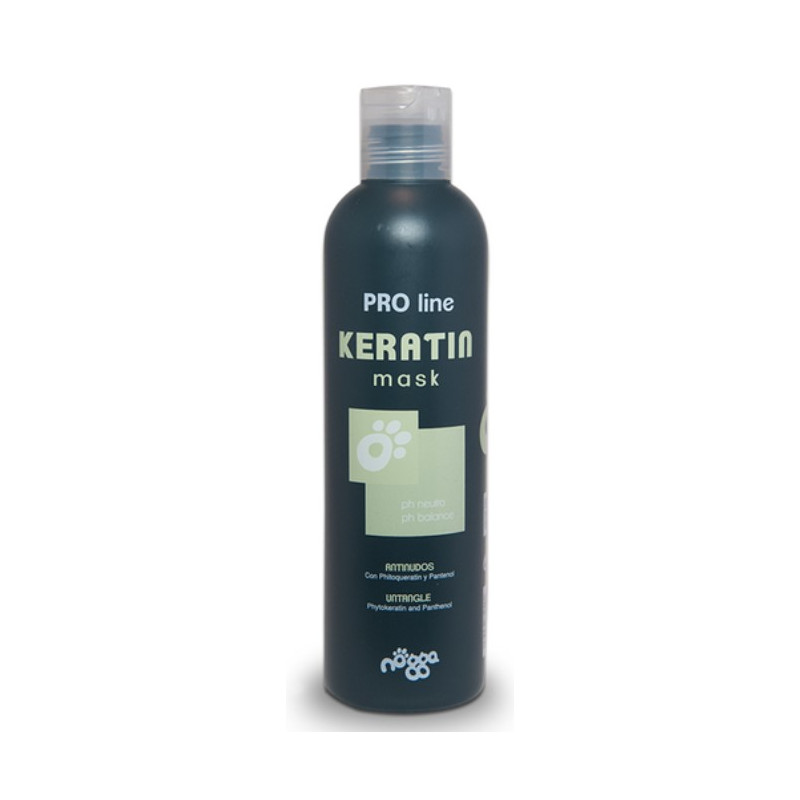MASCARILLA RESTAURADORA, ANTINUDOS Activos como la queratina como proteína vegetal afín a la proteína animal, el pantenol y la glicerina con su efecto reparador (sella la cutícula dañada), nos permiten cepillar el manto más dañado y anudado dejándolo en perfecto estado.