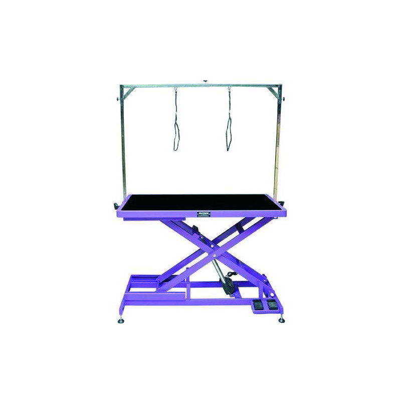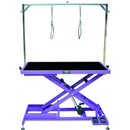 Mesa eléctrica con doble pedal de actuación. Es una mesa muy baja, altura mínima de 21cm del suelo. Lo que permite subir sólo al animal.