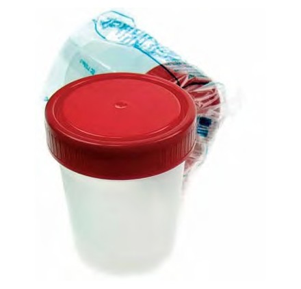 Envase unitario estéril, polipropileno transparente, con banda mate en el cuerpo central, para etiquetas e inscripciones. Tapón roscado. Capacidad 150mls con escala grabada hasta 100ml