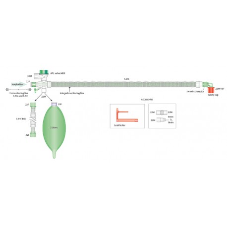 Circuito respiratorio coaxial UniFlow completo de 30mm con balón reservorio de 2L, línea de monitorización integrada y ramal de 0.5m, longitud 1.6m. Con codo fijo, línea de monitorización integrada, conectores adicionales, válvula APL, balón de 2L y tapón de seguridad.