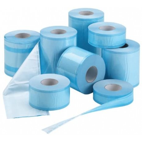Bobina compuesta por una cara en papel de grado médico y la otra de PET/PP azul (cierre por termoselladora).