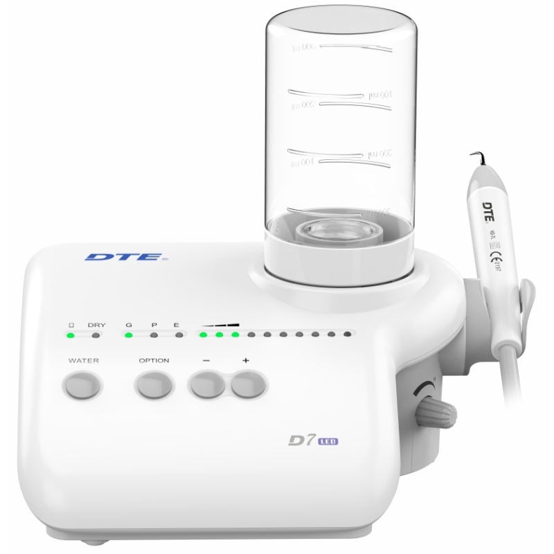 DTE D7 de la marca DTE Woodpecker es un aparato de sarro piezoeléctrico de sobremesa para tratamientos de profilaxis dental como: periodoncia, profilaxis dental y endodoncia. el equipo está equipado con un depósito de agua autónomo para usar con agua o con productos clínicos como hipoclorito, peróxido de hidrógeno y clorexidina. Con respecto a su diseño, es compacto y resistente porque se puede manipulas con guantes mojados, también cuanta con un display para ajustar los diferentes programas de manera intuitiva junto con sus botones.