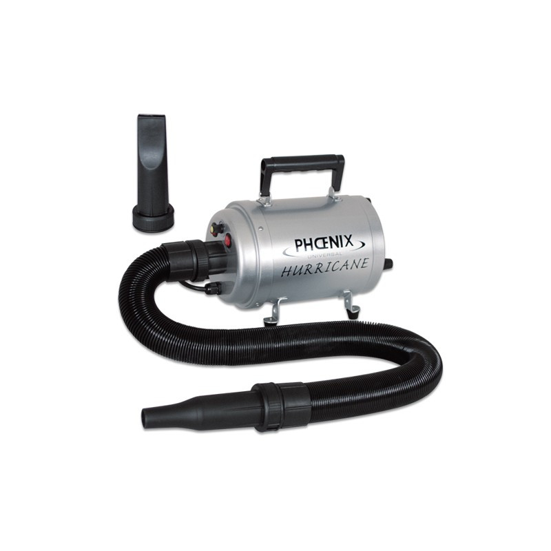 Secador Expulsador TYPHOON 2 Motores Sobremesa • Potencia máxima 3000W. • Temperatura máxima 52 ° C • Tres boquillas intercambiables que se acoplan a la manguera mediante 1/4 de rosca. Protección de neopreno para el calor. • Flujo de aire máximo 150 L/S. • Nivel sonoro 85dB • Peso neto 6,7 kg • Medidas: 40x35x25 cm.